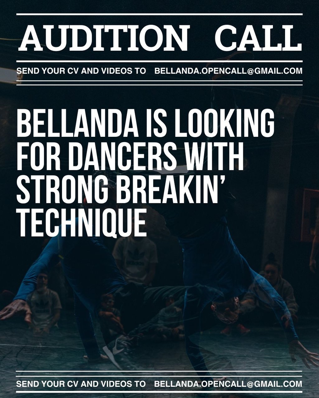 Per candidarsi, inviare curriculum e video (video preferibilmente NON di gruppo) a: bellanda.opencall@gmail.com