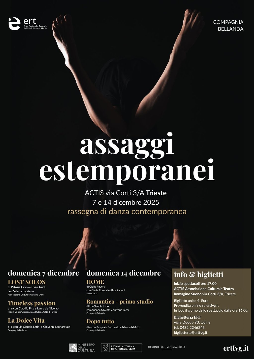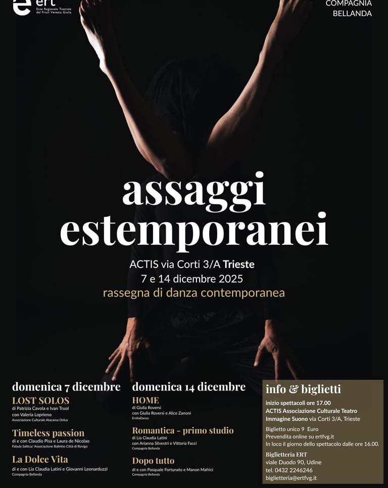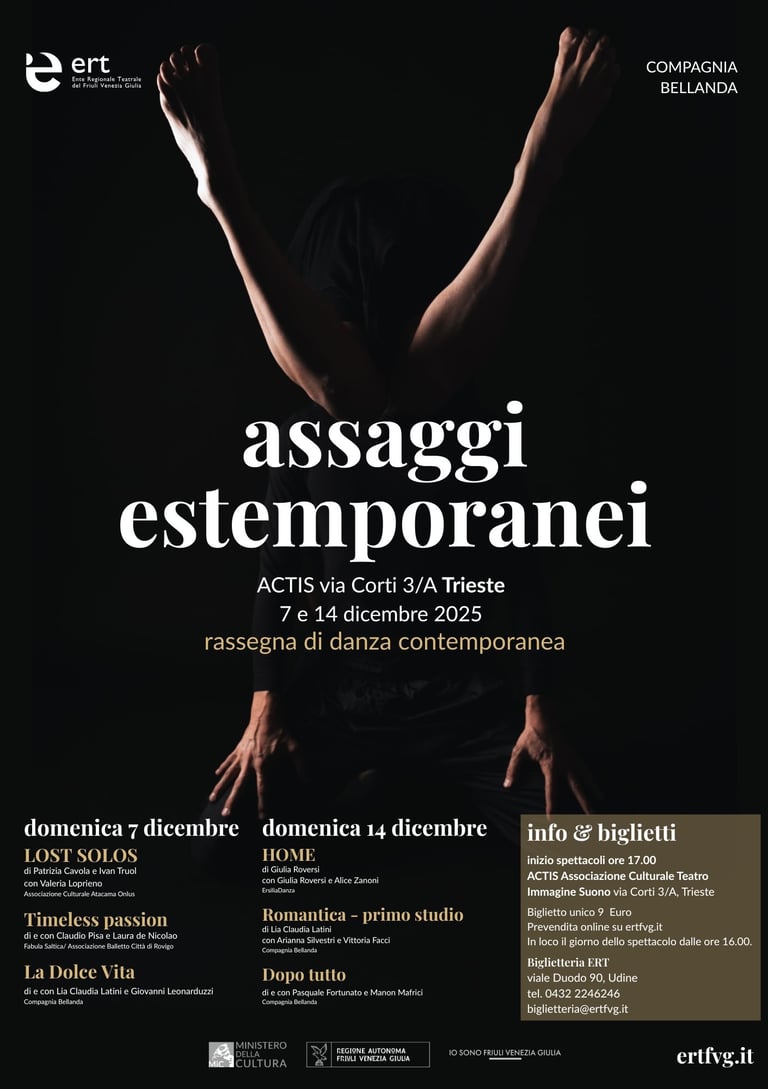 Due giornate dedicate alla danza contemporanea, organizzate da Compagnia Bellanda insieme all’Ente Regionale Teatrale del Friuli Venezia Giulia. Assaggi estemporanei è nuovo “contenitore” performativo che offre un’opportunità unica per il pubblico di interagire con la danza in fase di creazione, in eventi intimi e assistendo a spettacoli non finiti, dove la ricerca artistica e il processo creativo sono messi al centro del feedback. Si rende quindi il pubblico maggiormente consapevole del suo ruolo decisivo nella crescita della performance stessa, stimolandolo così a diventare parte integrante della performance e mantenendo una relazione di vicinanza e intimità con l’artista e il suo lavoro in evoluzione.